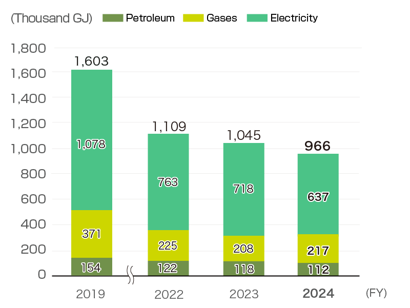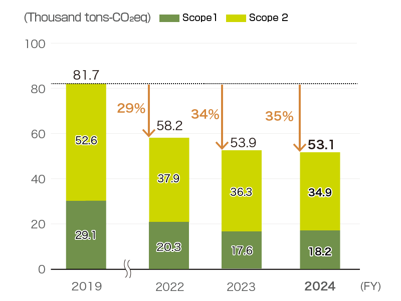 GHG emissions for all global bases in fiscal 2024 were 53.1 thousand t-CO2eq, down 35% compared to fiscal 2019.