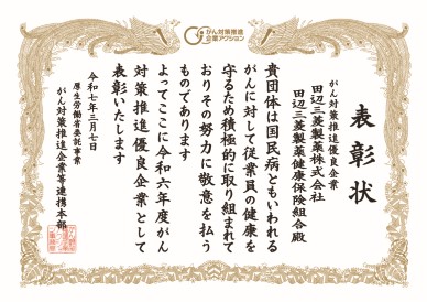 We were selected for five consecutive years under the Action Plan for the Promotion of Cancer Control, a project commissioned by the Ministry of Health, Labour and Welfare, for recognition and commendation as a 2022 Cancer Control Promotion Excellent Company for our cancer prevention efforts on behalf of employees.