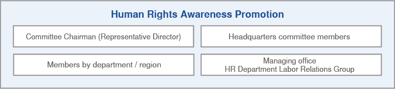 Based on these regulations, we have established the Human Rights Awareness Promotion Committee, chaired by the Representative Director, as a deliberative body for the planning and promotion of companywide human rights awareness policies. Furthermore, headquarters committee members, department committee members, and regional committee members play a key role in holding in-house training for officers and employees, and promoting awareness of human rights and diversity.