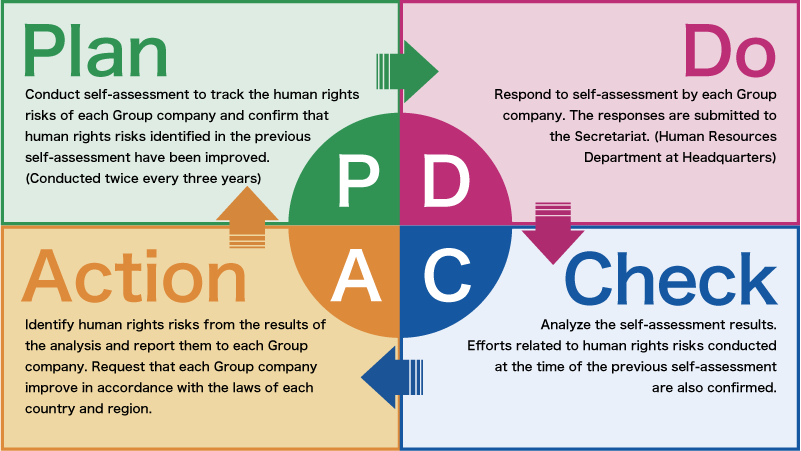 We conducted self-assessment of human rights in February and March of 2025, targeting 11 companies within the Group (including our overseas offices). This assessment is intended to assess human rights risks at each company and to check whether the human rights risks identified in the previous self-assessment have been improved. We collected responses from each company and compare and evaluate the results with reference to those obtained in the previous assessment, and check the status of our efforts.