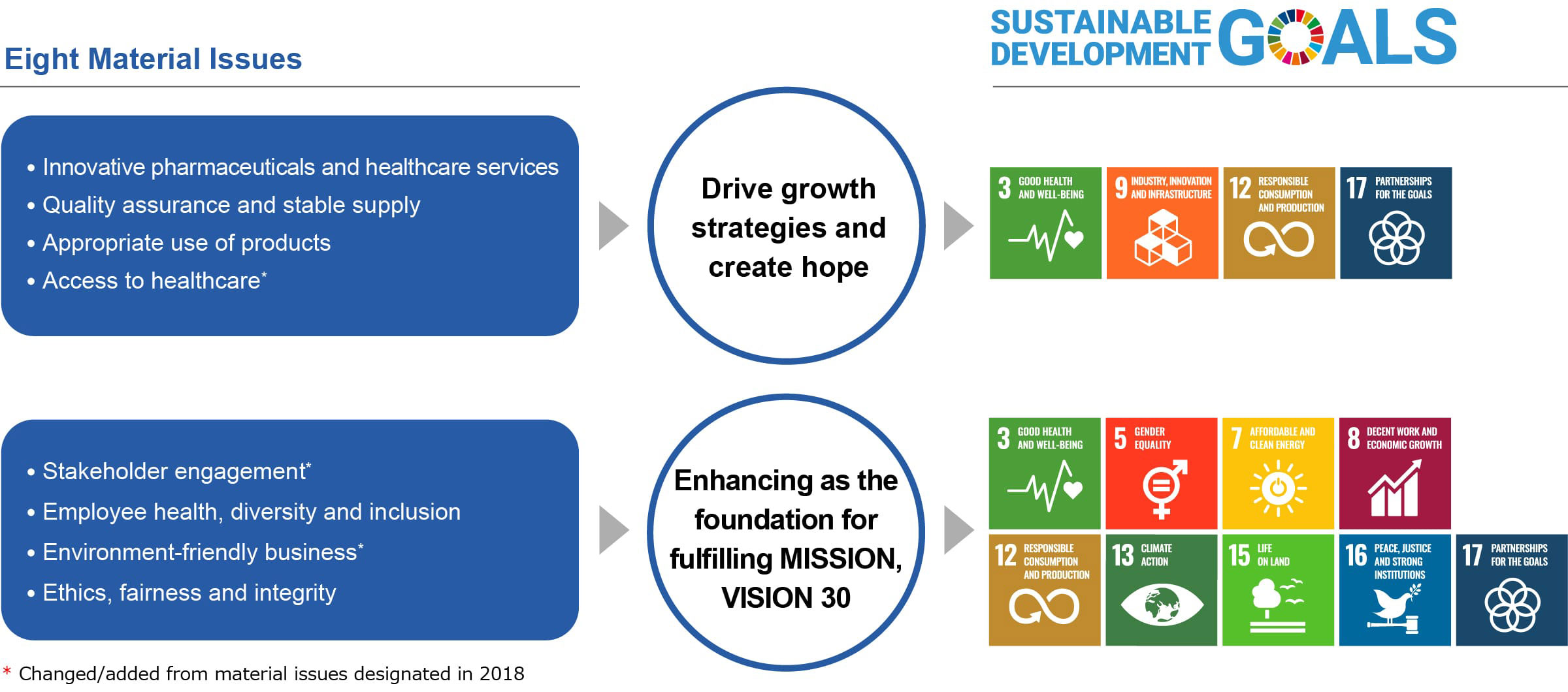 Recognizing the changes, we looked back at our achievements and forward to the future of healthcare, and reevaluated the role that Tanabe Pharma should play in the society of the future. This reevaluation led us to recast our corporate philosophy into our MISSION and our vision into VISION 30. As part of these efforts, we identified the following eight items as new materialities from the perspective of what is important in helping to realize a sustainable society.