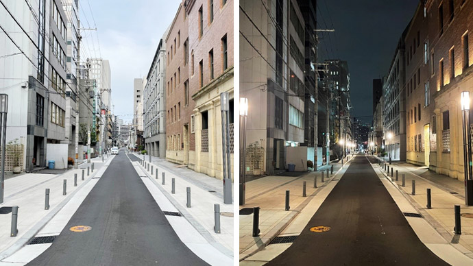 The Doshomachi Street Revitalization Project seeks to create attractive and people-friendly towns through public-private partnerships, and is working on a utility pole removal and road maintenance project in an area of Doshomachi that meets the demands of local landowners and relevant parties. A sidewalk was created in May 2022, creating an all-new nighttime view. By 2027, we plan to complete the removal of the utility poles along with moving power lines underground.