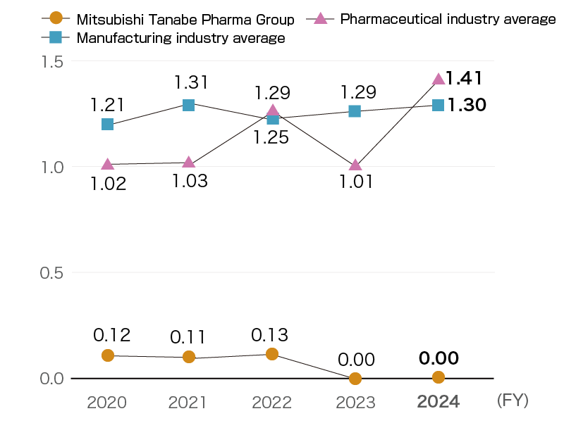 In fiscal 2024, as a result of a range of safety measures, there were no lost time injuries in our operations in Japan, where we thus achieved our goal of a frequency rate of less than 0.20 lost time injuries. (There were also no incidences of lost time injury overseas.)