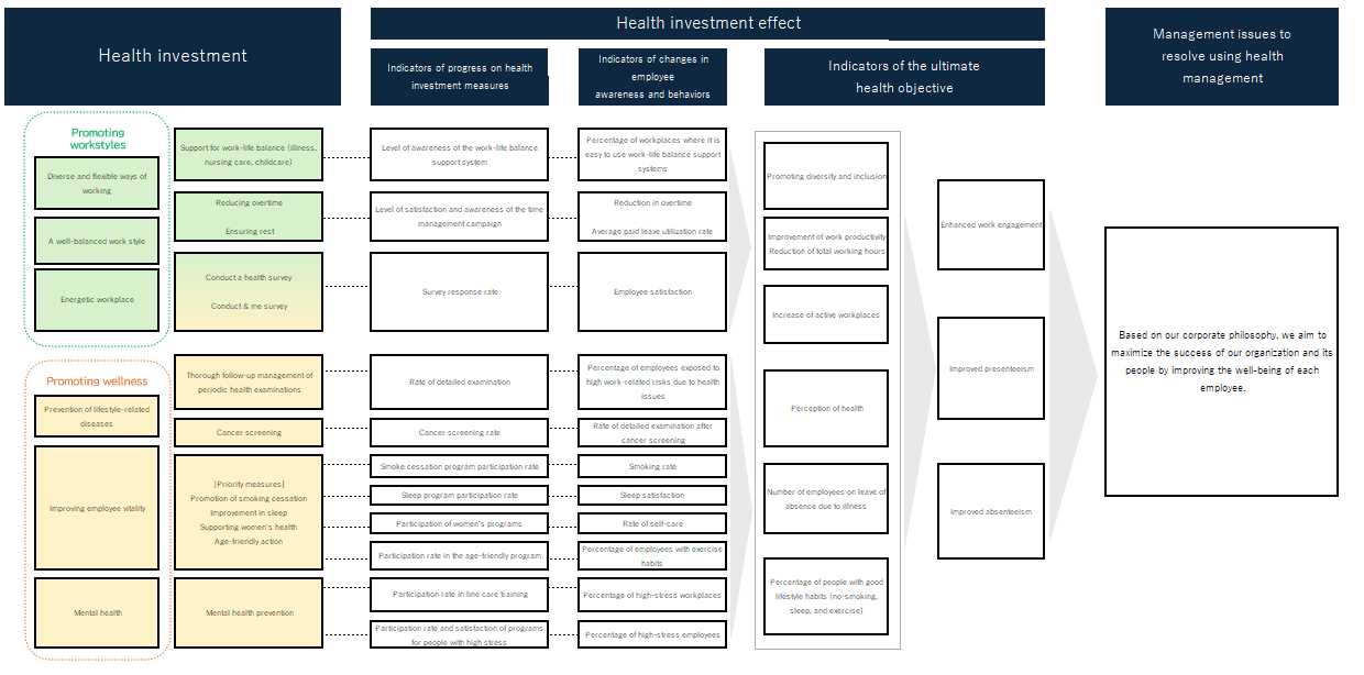 The Group has defined the following health policy, which it is working to implement. With regard to initiatives for health management, the Group cooperates with the health insurance union to hold an annual health management promotion committee meeting at which labor health management coordinators, health management officers, health staff, and representatives of insured individuals discuss the background, challenges, and achievements of health management efforts, and exchange opinions.