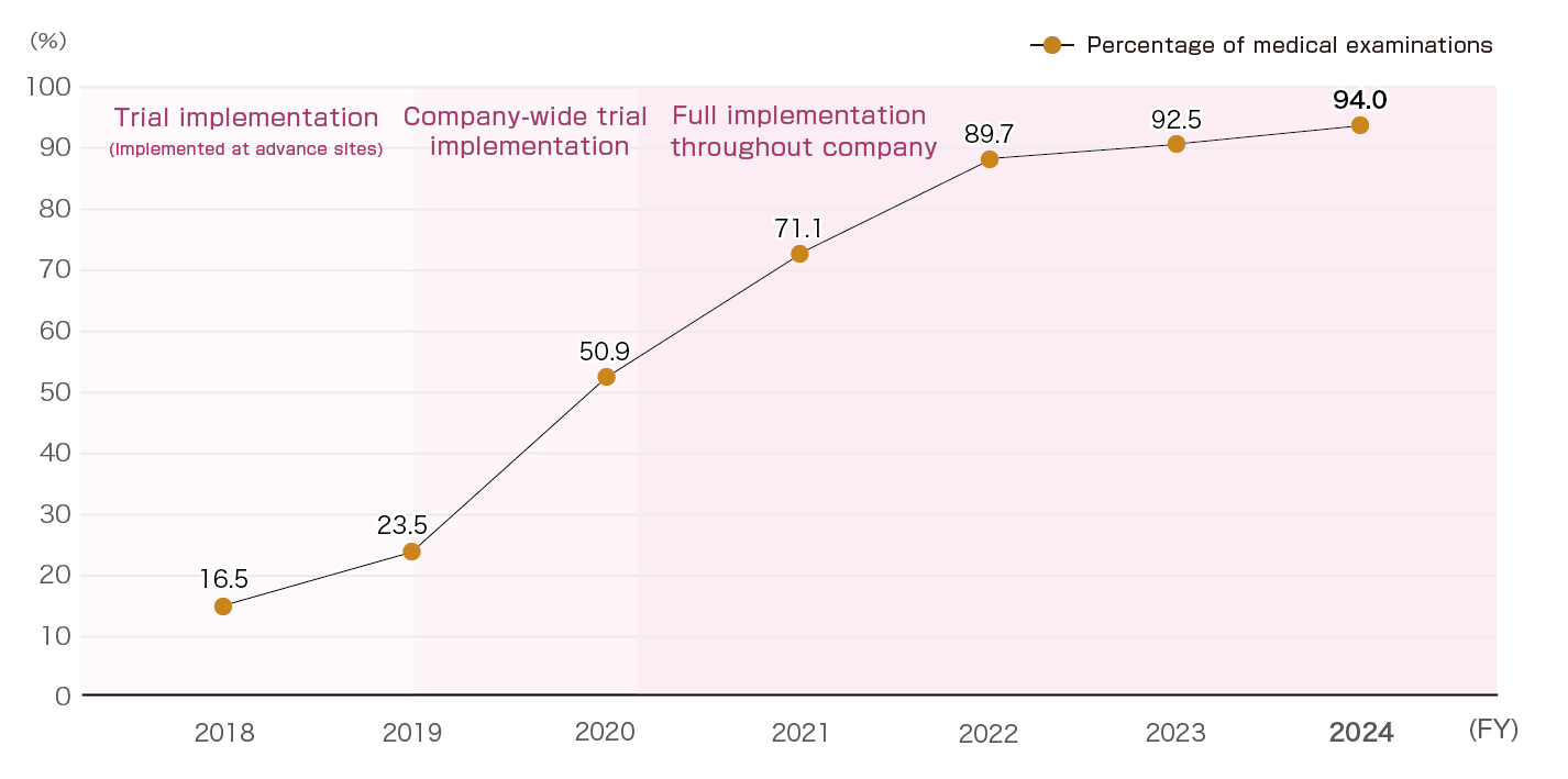 Since fiscal 2018, we have been encouraging employees aged 35 and over to have comprehensive physical examinations instead of periodic health checkups. We hope that substituting the results of comprehensive physical examinations for those of periodic health checks will increase the rate of participation in cancer screening, and in fact, uptake of screening for the five major forms of cancer is increasing yearly.