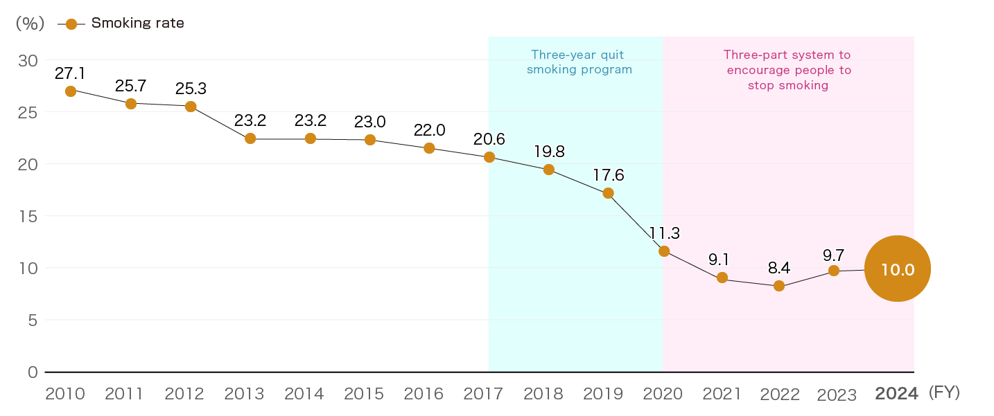Starting in fiscal 2017, we have promoted a three-year program to help people quit smoking, and our working rules state clearly that smoking is prohibited on company premises at all times. From fiscal 2020, the Company, its health issuance association, and its labor union have worked as one to create a framework to encourage people to stop smoking and are aiming to reduce the smoking rate, with top management from each organization, including the President and Representative Director (the Company), the chairman of the labor union, and the chairman of the health insurance association offering messages to encourage people to stop smoking, with the goal of creating a smoke-free culture. The smoking rate, which was 22% when we instituted our measures to stop people smoking, dropped to 8.4% in fiscal 2022. However, the rate has risen slightly over the past two years, and accordingly we have implemented a new MinChalle program in which people use a habit-forming app to support them in their efforts to stop smoking and encourage them in their efforts to give up smoking for good.