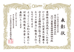 We were selected under the Action Plan for the Promotion of Cancer Control, a project commissioned by the Ministry of Health, Labour and Welfare, for recognition and commendation as a Cancer Control Promotion Excellent Company for the fifth consecutive year in recognition of our cancer prevention efforts on behalf of our employees.