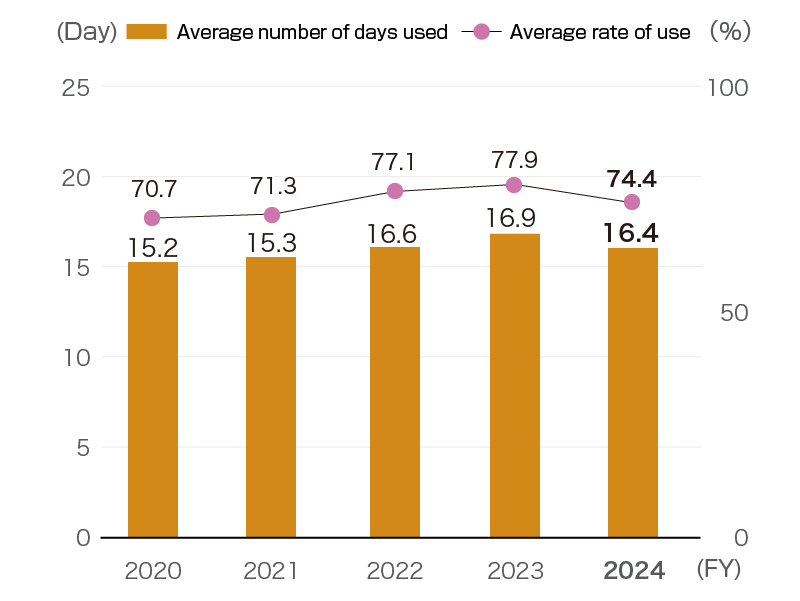 To achieve a paid leave utilization rate of 70% (15 days) or more, we will establish annual paid leave days taken simultaneously by all employees (two days a year), set aside days to encourage employees to take paid leave (five days a year), and individually follow up with employees who have not taken paid leave.