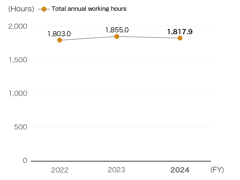 The paid leave utilization rate target of 70% was achieved, with 74.4% of people taking paid leave. From fiscal 2024, the Company did not set a companywide target for the number of employees working long hours (overtime in excess of 360 hours per year), including managers and supervisors, but conducted TM exercises (1)/(2) through which it set targets for total hours worked per year, met this target of less than 1,850 hours per year at 1,817.9 hours.