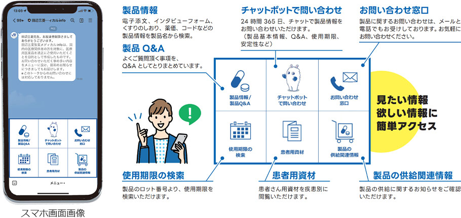 This account allows people to access the product information they want quickly and easily using a smartphone, and we will also use it to deliver the latest information on drug supply, revisions to package inserts, and other in a timely fashion.