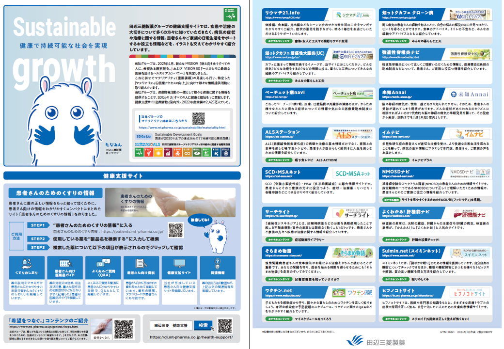 On these websites, we provide useful information with illustrations about the symptoms, diagnoses, and treatment of these diseases that helps many people gain an understanding of diseases and the importance of treatment, and supports the daily lives of patients and their families. We have also prepared leaflets that summarize the information on the health support websites so that healthcare professionals including doctors and pharmacists can present them to patients and their families.
