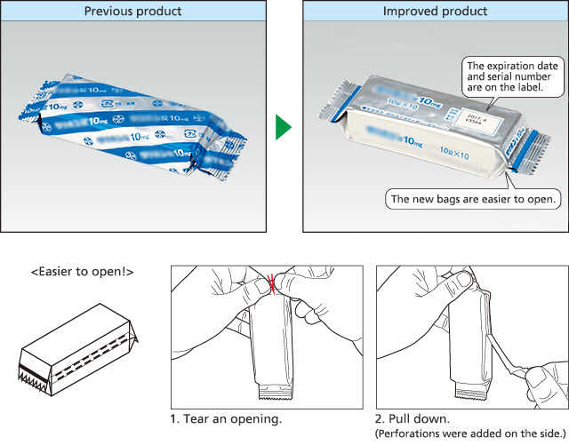 We are also working actively to improve the ease of use of pharmaceuticals. Medical institutions provided feedback that the aluminum bags containing the pharmaceutical packaging sheets (PTP sheets) were difficult to open and it was not easy to take out the product. In response, we worked in cooperation with the material manufacturer to develop aluminum bags that are easy to open and make it easy to take out the product. These improved aluminum bags received the Pharmaceutical and Medical Packaging Award at the Japan Packaging Contest 2016 (sponsored by the Japan Packaging Institute).