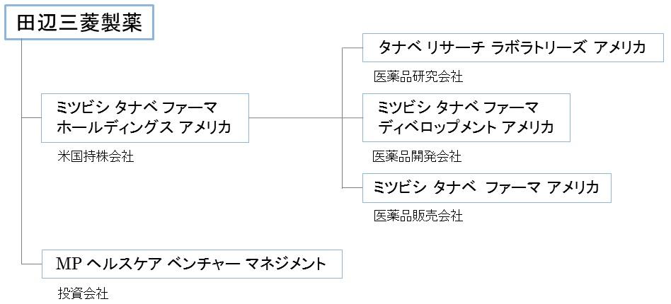 当社は、米国展開の加速化に向け、米国持株会社である「Mitsubishi Tanabe Pharma Holdings America, Inc.(以下、MTHA)」を米国統括会社として位置づけ、米国関係会社を再編し、そのMTHA傘下に、医薬品研究会社「Tanabe Research Laboratories U.S.A., Inc.」、医薬品開発会社「Mitsubishi Tanabe Pharma Development America, Inc.(以下、MTDA)」、バイオベンチャーへの投資会社「MP Healthcare Venture Management, Inc.」を配置します。