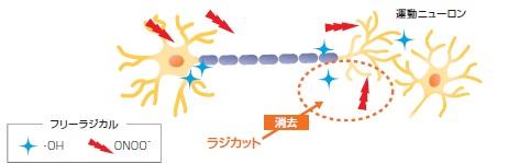 エダラボンは当社が創製したフリーラジカル消去剤であり、ALSの病態で 上昇するフリーラジカルを消去して無害化すると考えられています。