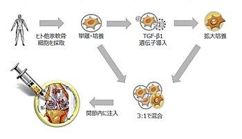 本剤はTGF-β1遺伝子導入軟骨細胞が関節腔に混合注入した培養軟骨細胞の関節軟骨への生着を高めると共に、これらの細胞が軟骨代謝異常を改善すると考えられます。変形性膝関節症の疼痛緩和効果が確認されており、さらに軟骨破壊進展を抑制することが期待されます。KLS社が実施した韓国フェーズ3試験では、関節機能改善の指標であるIKDC(International Knee Documentation Committee)スコアおよび疼痛指標であるVAS(Visual Analog Scale)について、プラセボ群と比較しており、KLS社はこの結果を以って2016年7月に韓国の食品医薬品安全処に対し生物製剤許可申請を行っています。