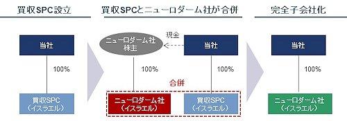 今後、ニューロダーム社の株主総会での承認、およびその他法的手続きの完了を条件に、ニューロダーム社を存続会社とし、当社のイスラエル国における買収目的会社(以下、「SPC」)を消滅会社とする逆三角合併を行い、ニューロダーム社は当社の完全子会社となる予定です。