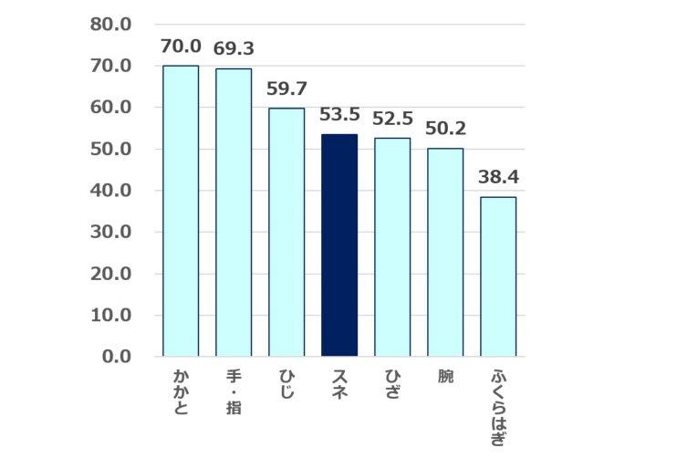 田辺三菱製薬が2017年に実施した「肌の乾燥に関する調査」では、20~60代女性の半数以上が1年以内に「スネ」に乾燥を経験していることがわかりました。また、その割合は体の他の部位と比較しても出現率が高い結果となりました。しかし、保湿クリームなどで一時的な対処をされている方が多いのが現状です。