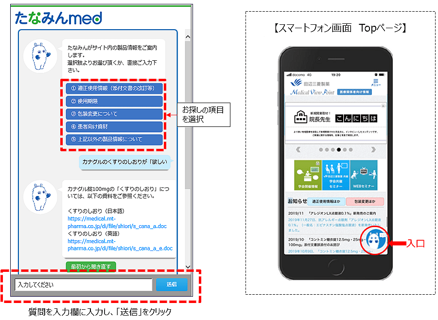 「たなみんmed」は、株式会社日立システムズ(本社:東京都品川区、代表取締役 取締役社長:北野 昌宏) が提供する対話型自動応答AIサービス「CAIWA(カイワ) *2」に当社の製品情報データベースを連携させたシステムです。医療関係者が入力した文章の意味をAIが認識し、約160品目の製品の医薬品基本情報へ迅速に誘導し、回答を提示します。使用期限検索、患者さん向け資材、くすりのしおりや包装仕様も簡単に確認できるチャットボットです。
