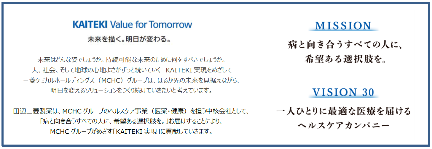 - 未来の社会課題の解決に向けた田辺三菱製薬の存在意義と2030年のめざす姿を示すMISSION、VISION 30を策定