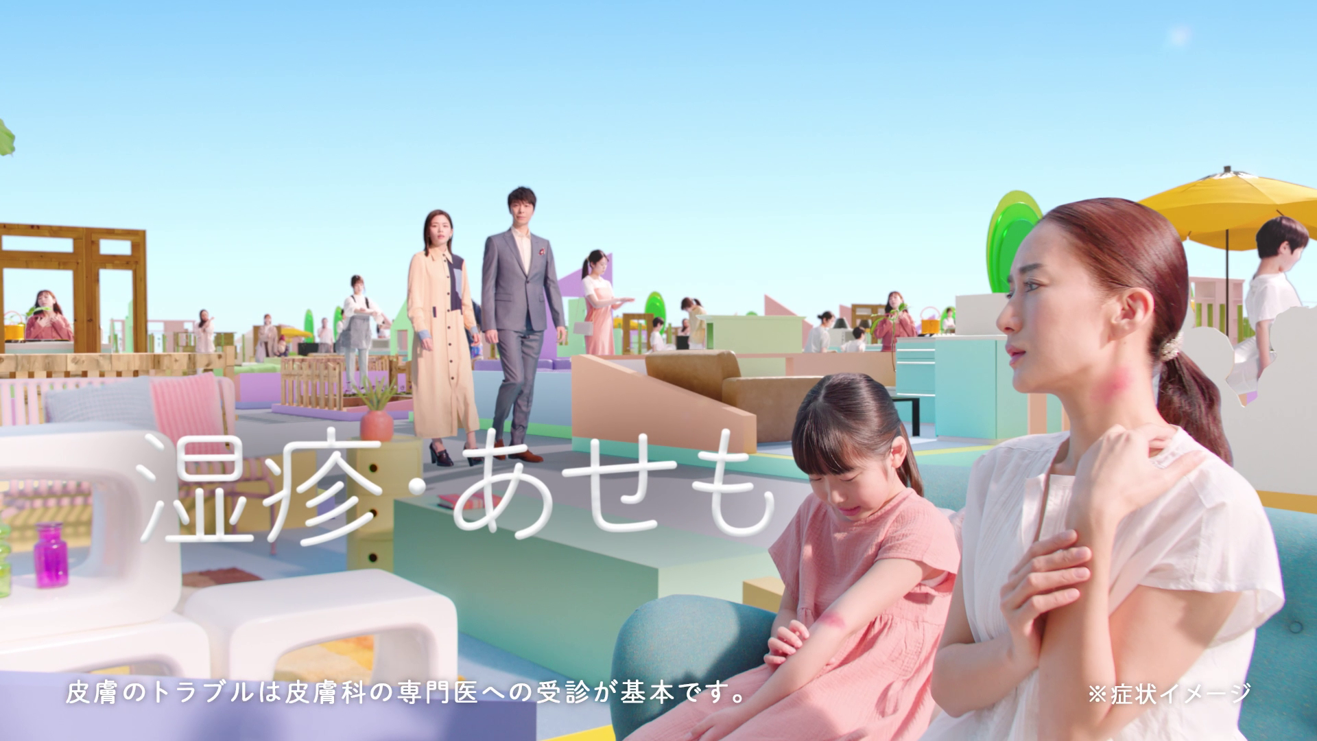 季節によって、皮膚トラブルはいろいろ。新CMでは、夏のキャンプや冬の水仕事など、季節を象徴するさまざまな生活シーンを表現した空間を、長谷川さんと小芝さんが巡ります。夏の湿疹やあせもと虫さされ、冬の手湿疹や乾燥湿疹などに悩む患者さんに寄り添いながら、製品を紹介しています。「フルコートⓇf」と「コートfⓇ」シリーズは、あらゆる季節のさまざまな生活シーンで症状改善を期待できるというメッセージを、長谷川さんと小芝さんが、温かく、また力強く、みなさんにお伝えします。