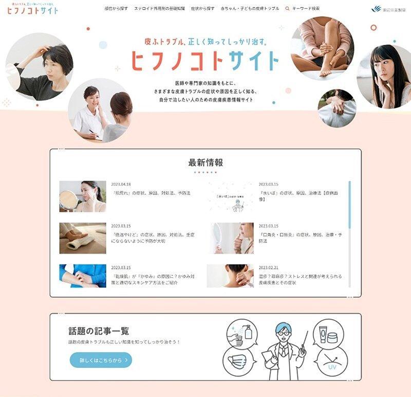 「ヒフノコトサイト」は、皮膚トラブルの原因・症状・治療法について、医師や薬剤師の解説を交えながら、生活者にわかりやすく情報を発信していくwebサイトとして2009年に開設しました。現在では、多くの方が訪れる、国内最大級の皮膚ケア・ポータルサイトです。
