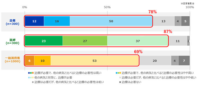 - 肥満症は、他の病気と同等またはそれ以上に「治療が必要」と回答した患者は78%、医師は87%、一般生活者69%であり、すべての層で約7割以上に上った。肥満症の治療の必要性については社会全体で認識が高い傾向が明らかとなった。