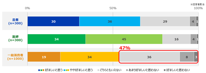 - 肥満症患者78%、医師87%、一般生活者69%が、肥満症治療は他の病気と同等またはそれ以上に「治療が必要」と回答。しかし、保険診療で肥満症治療が積極的に行われることについては、一般生活者の約半数が「好ましいと思わない」または「どちらともいえない」と回答