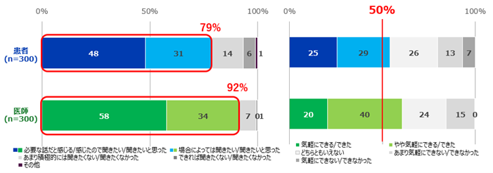 - 診療時、体重に関する話を「聞きたい」患者が79%、医師が92%。しかし、両者とも体重に関して「気軽に話せる」かどうかについては半数近くが「気軽にできる」と回答しなかった。