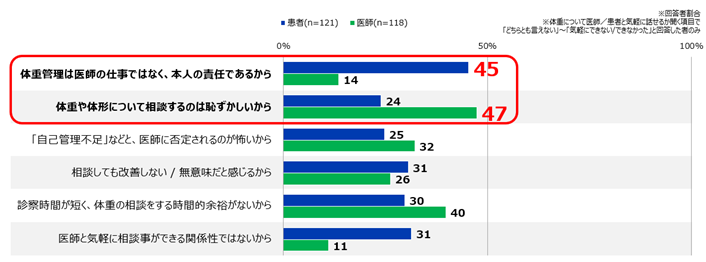 - 気軽に話せない理由は、「(患者さんが)恥ずかしいから」と思っている医師に対し、肥満症患者は「体重管理は医師の仕事ではなく、本人の責任だから」が最多であった。