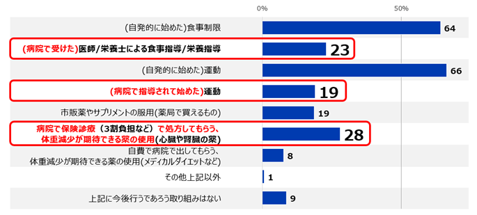 - 「肥満や肥満症は複数の複合要因で起きる」という前提でも、今後取り組みたい体重管理の方法について聞くと、“病院で受けた食事・栄養指導”や、“病院で指導された運動”、“保険診療で処方される薬”といった医療介入を選択する肥満症患者は、それぞれ3割未満にとどまった。