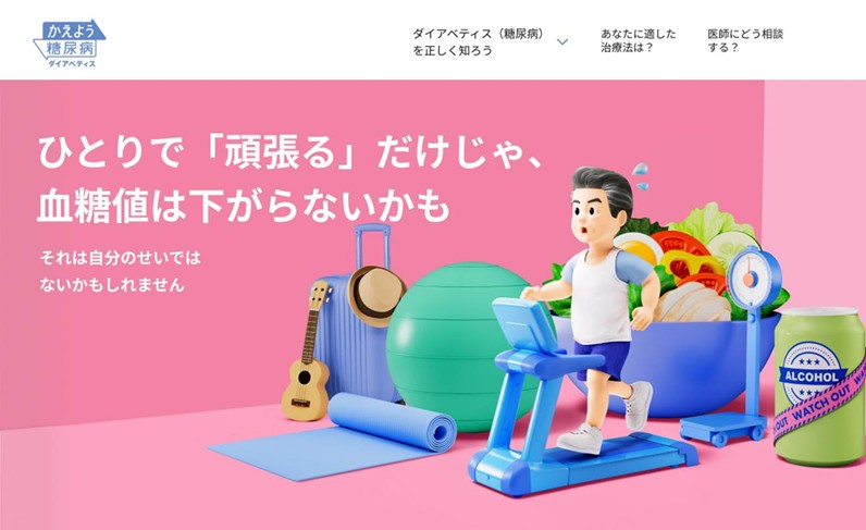 血糖値が改善しないのは自身の努力だけではなく、体質や環境要因が影響していることについての解説を含め、ダイアベティスの正しい疾患理解を促すコンテンツを展開しています。ダイアベティスのある人が、糖尿病とともに生きる上での悩みをひとりで抱え込まずに、自分に合った治療法について医師と話しあうことの重要性を伝えています。またサイト内には、医師へ相談する際のサポート資材として、医師に相談する際に使用できる「話そうシート」を掲載しています。詳細はウェブサイトをご覧ください。https://www.kaeyou-dm.com
