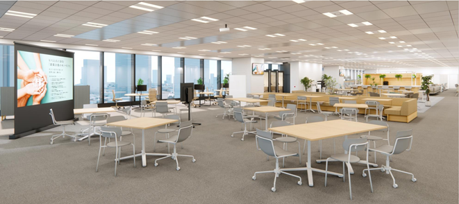 新オフィスでは、働き方の変化にも柔軟に対応可能な「シンプル、かつ生産性の高いオフィス」を実現します。従業員一人ひとりが業務内容に応じて働く場所を主体的に選択できる空間設計を採用し、従業員同士の積極的なコミュニケーションや偶発的な交流を促進することで、エンゲージメントの向上とイノベーションの創出をめざします。