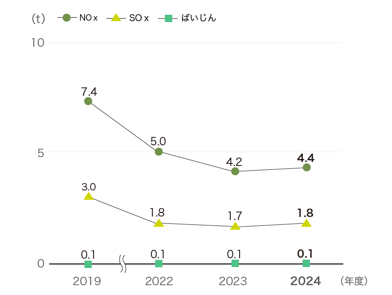 国内拠点では概ね、ばい煙発生機器の燃料を油類からガス類に転換しており、ばい煙中の大気汚染物質濃度を低下させています。