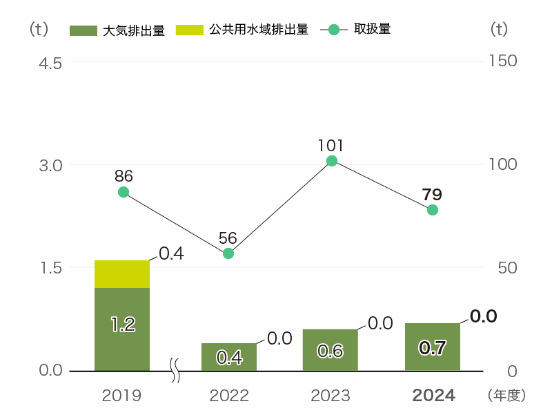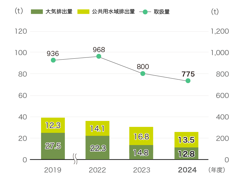 当社グループでは、化学物質排出把握管理促進法に基づき、当社施設で取り扱うPRTR対象物質の取扱量と環境への排出量の管理を進めるとともに、監督官庁に適正に届出を行っています。