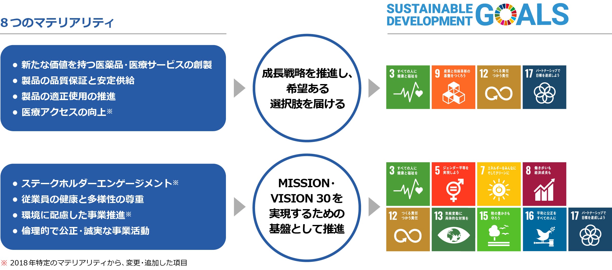 マテリアリティを特定するにあたり、国際的なガイドライン、GRIスタンダードなどに加え、SASB※1の製薬産業の評価基準、ATMインデックス※2の評価項目なども勘案し、考慮すべき社会課題を包括的に抽出しました。