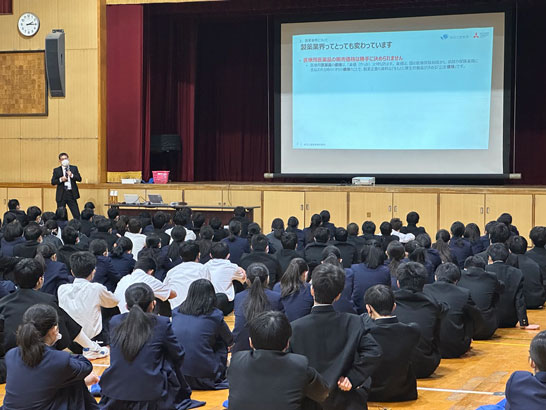 当社では、従業員が学校へ赴き講師となる出前授業を行っています。2021年度より、文部科学省が推進する「土曜学習応援団」に参画し、「製薬企業の仕事」(新薬の研究・開発など)や「ものづくり」をテーマにしたプログラムを提供しています。2024年度は、5校の出前授業を実施しました。