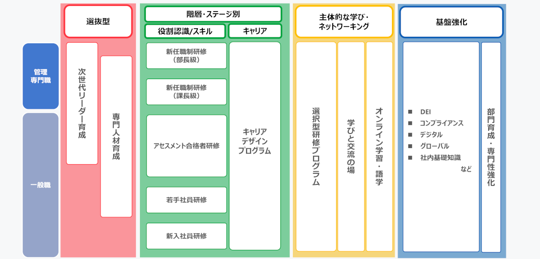 これらのプログラムを通じて、従業員が日々の業務から課題を見出し、解決していく経験から学び、成長するプロセスを支援・強化し、一人ひとりがキャリアを自ら切り拓き、多様な価値観・思考や高度な専門性を結集させ、自らのリーダーシップでその能力を開発・発揮することを支援していきます。
