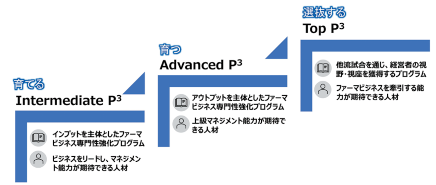 次世代の経営リーダー候補を継続的に育成する目的で、P3(キューブ)研修プログラムを3階層に向けて実施しています。構想力・人間力を中心としてビジネスリーダーに必要な経営スキルを学ぶとともに、将来の経営チームのネットワーキング構築も促しています。