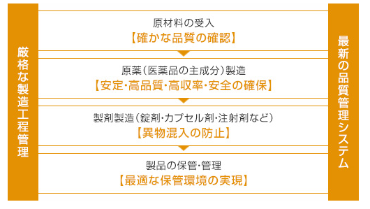 当社グループは、高品質な医薬品を製造・供給し、患者さんや医療従事者の皆さんに安心安全にご使用いただくために、国内外から調達した原材料の受入試験からGMPに準拠した原薬・製剤製造ならびに試験検査に至るまで、製品の品質を厳格に管理し、国際創薬企業として長年培った幅広い技術・独自のノウハウに基づいて医薬品を製造しています。